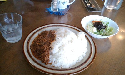 なかなか変り種。細かくほぐした繊維状の鶏肉がルーに混ざり合っていて、時々硬い、軟骨のような歯ごたえがある。