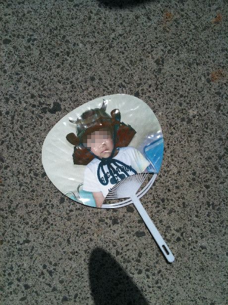 子供の顔写真に兜を合成したうちわ。どこかでそう言うサービスでもやっていたのか。すぐに持ち主の親御さんが拾いに現れ、深く調べられず。