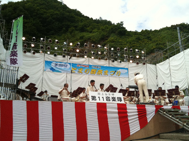 祭らしい薄い味つけの焼きそばや、フランクフルト、押し付けがましい商売っぷりのおばちゃんに買わされたきゅうりの漬物で満たされた腹に、自衛隊の演奏が響く。
