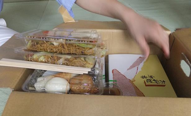 地元の仕出し弁当にお茶、は結構つきものだが、プラス屋台の食べ物セットでかなりのボリューム。というか、2食分。というか、しまった、ここでもおにぎりか、みたいな。