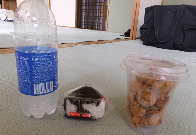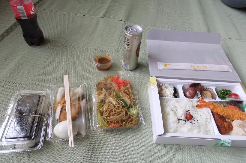 地元の仕出し弁当にお茶、は結構つきものだが、プラス屋台の食べ物セットでかなりのボリューム。というか、2食分。というか、しまった、ここでもおにぎりか、みたいな。