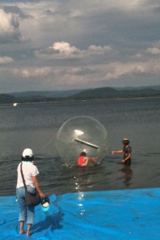 湖畔の祭ということで、今年はビニールの球体に入って湖上を歩ける水上歩行体験が目玉であった。