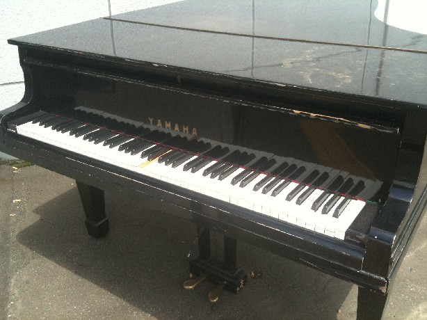 音楽スタジオの店頭に置かれた壊れピアノ。マジで野ざらし。何かの資料にどうぞ。