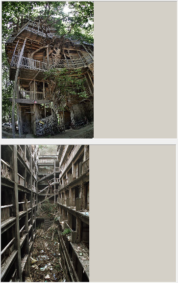 樹木と一体化したログハウスと軍艦島は、ちょオッと違わないか?